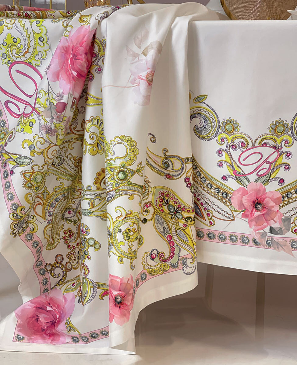 Tovaglia in cotone con stampa piazzata per 10/12 posti con logo Blumarine nella trama, elegantemente confezionata in scatola, perfetta come idea regalo.