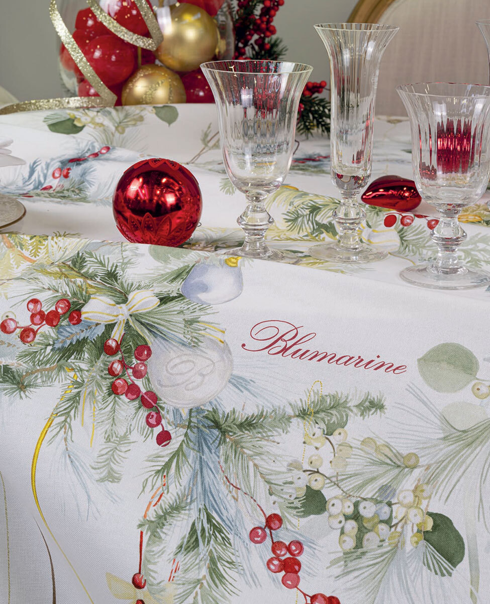 Tovaglia per 10/12 posti in cotone panama con stampa piazzata e logo Blumarine stampato nella trama, elegantemente confezionata in scatola, perfetta come idea regalo.