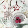 Tovaglia per 18 posti in panama con stampa piazzata, orlo con angoli a cappuccio, logo Blumarine stampato nella trama.