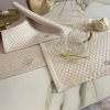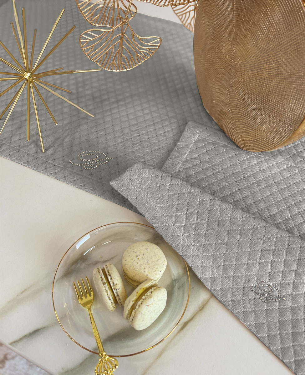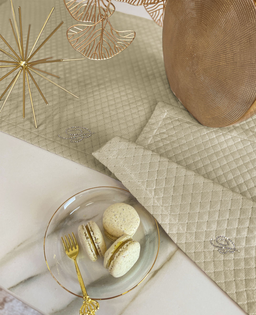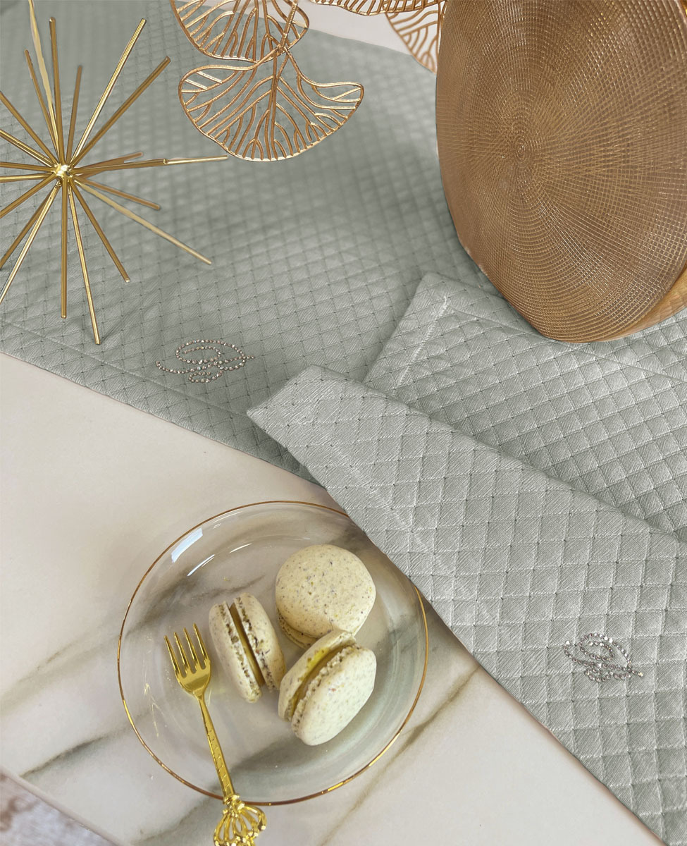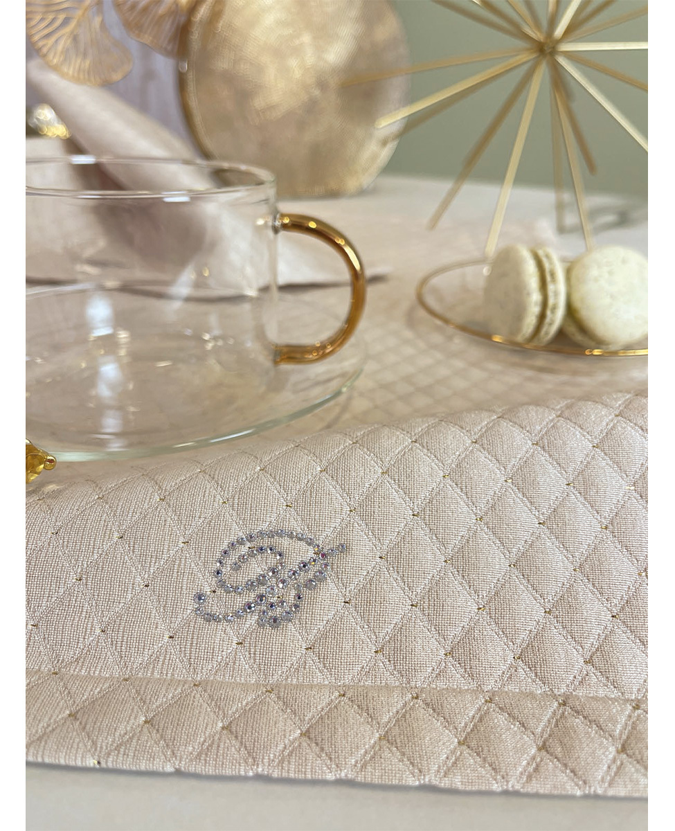 Tris di centrini in tessuto piqué jacquard con logo Blumarine in cristalli.