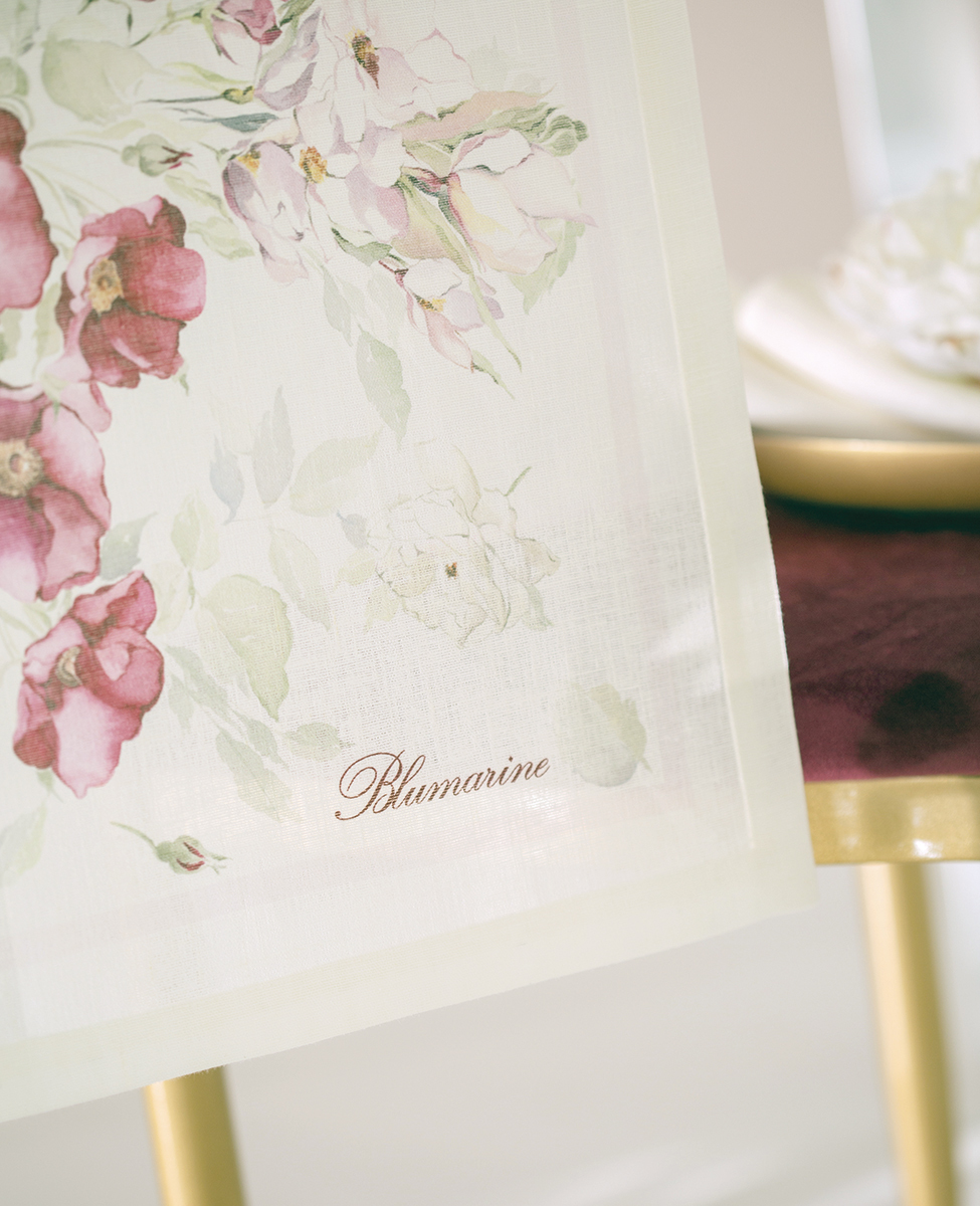 Canovaccio in lino con stampa piazzata e logo Blumarine presente nella trama.