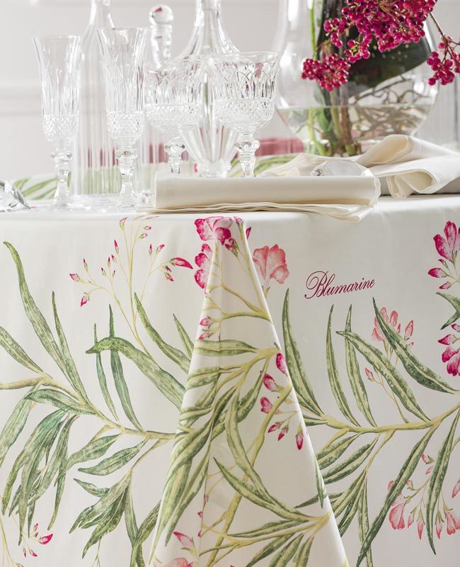 Tovaglia 10/12 posti in puro raso di cotone con stampa piazzata. Il tavolo della natura Blumarine, chic e di classe.