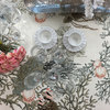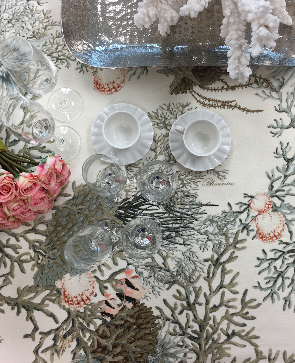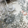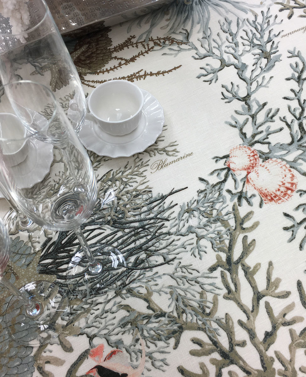 Tovaglia da 10/12 posti in con stampa all over. La magia dell'oceano su lino, nella cucina Blumarine.