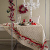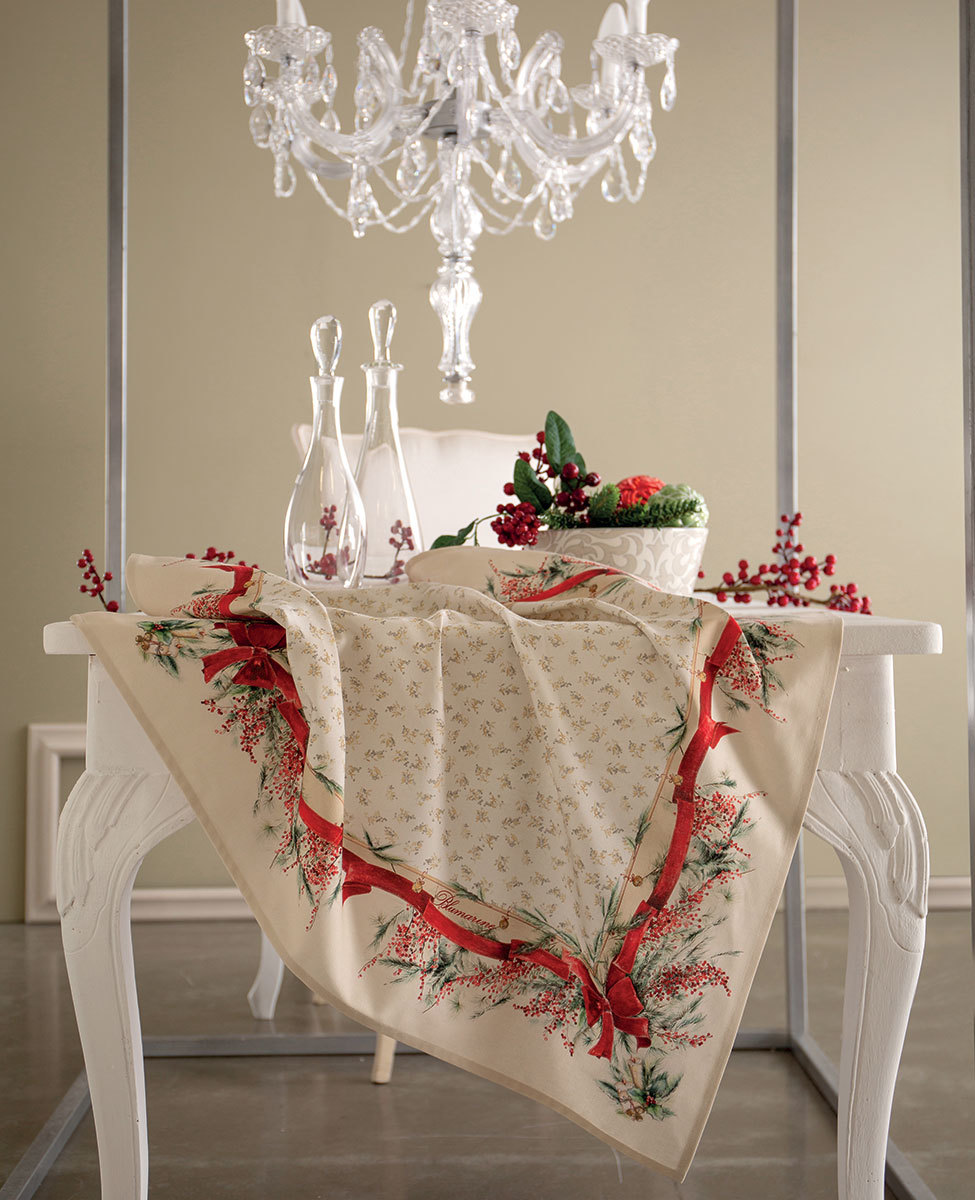 Tovaglia per 18 posti in cotone panama con stampa natalizia piazzata e logo Blumarine nella trama, elegantemente confezionata in scatola, perfetta come idea regalo.